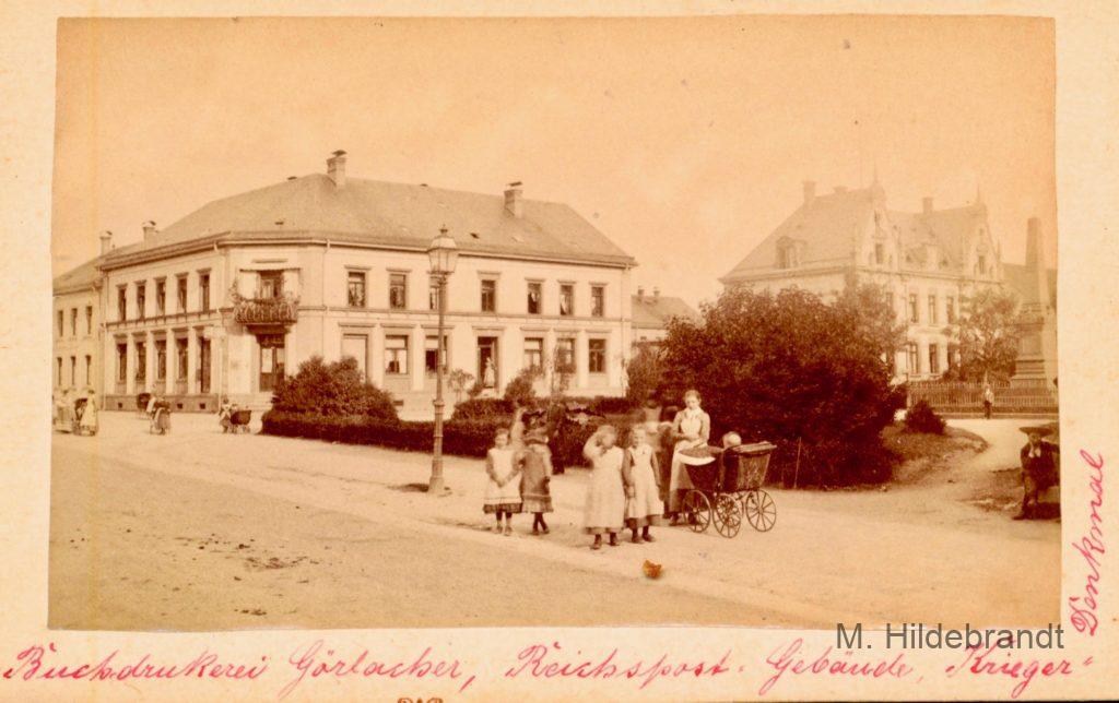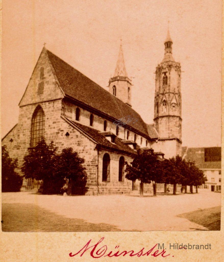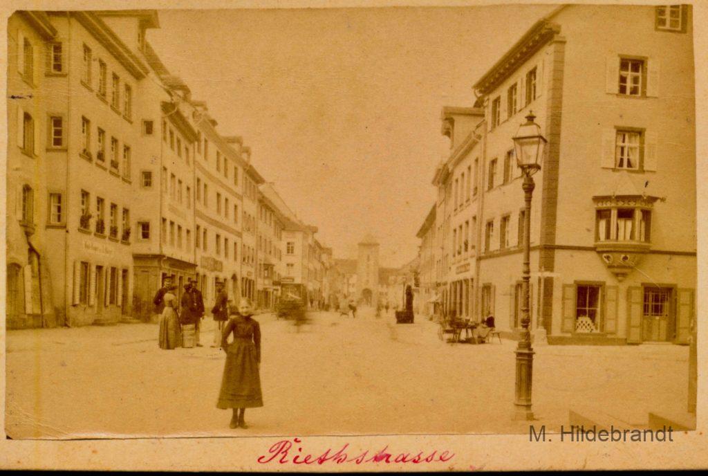 Villingen Leporello ca. 1890: Münster-Südturm noch mit 4 Schallfenstern, Kastanien-Bäume spenden Schatten, und auffallend viele Groß-Familien bei Spatziergängen (4 Chaisenwagen) am Krieger-Denkmal.