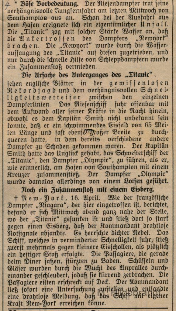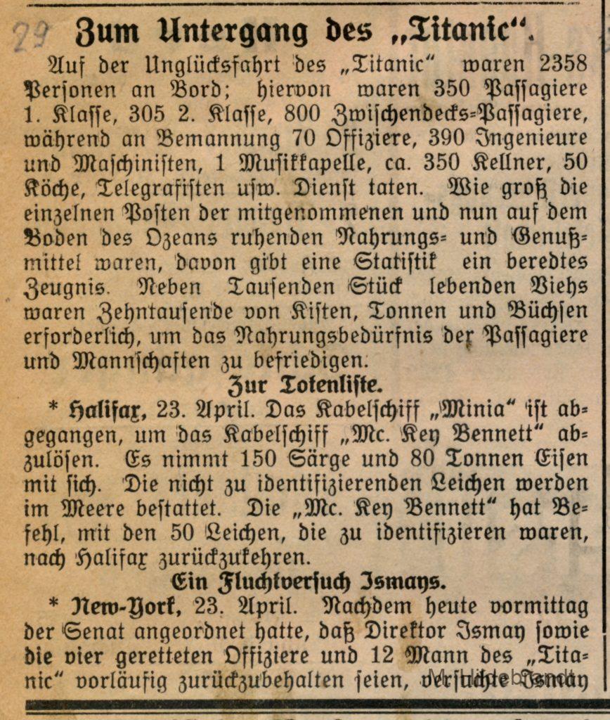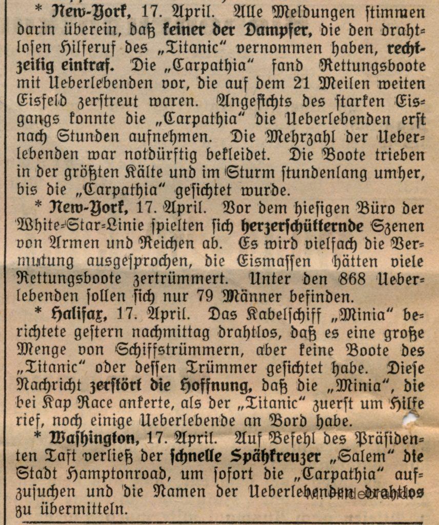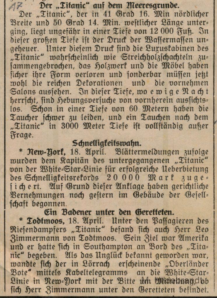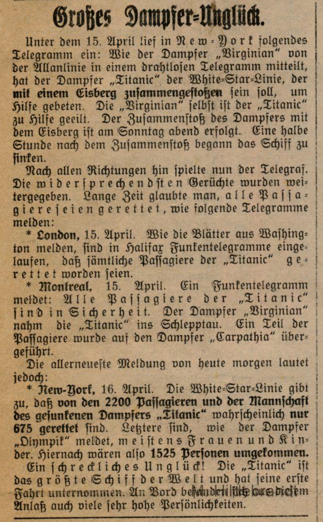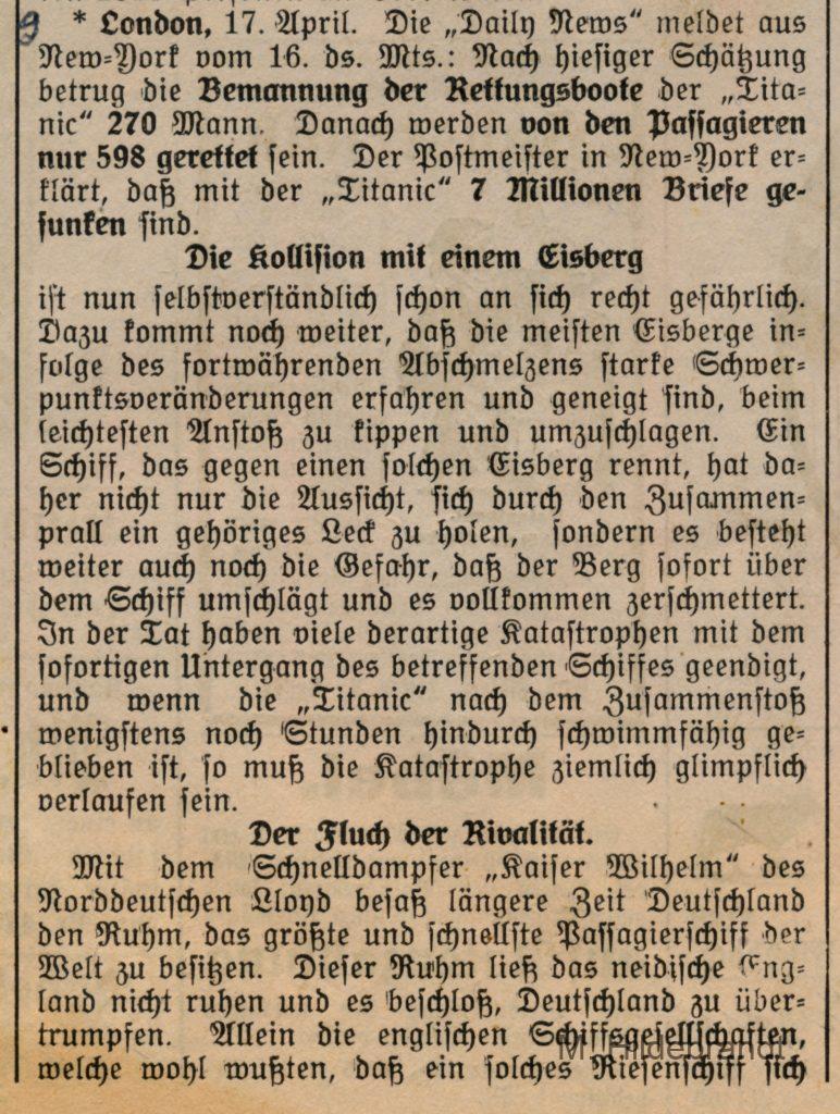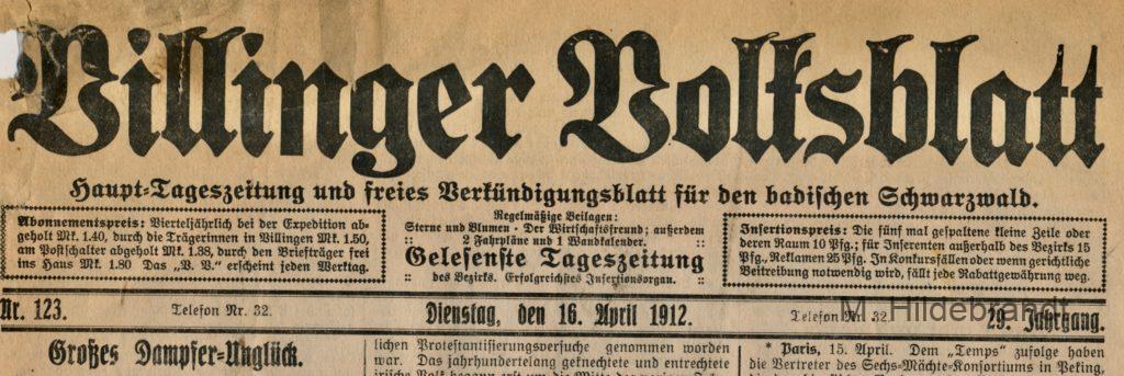 3 Antworten auf “Titanic-Untergang: am 15. April 1912 rammte das Dampf-Schiff einen riesigen Eisberg. Seltene Original-Berichte aus dem Villinger Volksblatt vom 16. bis 25.04.1912.”