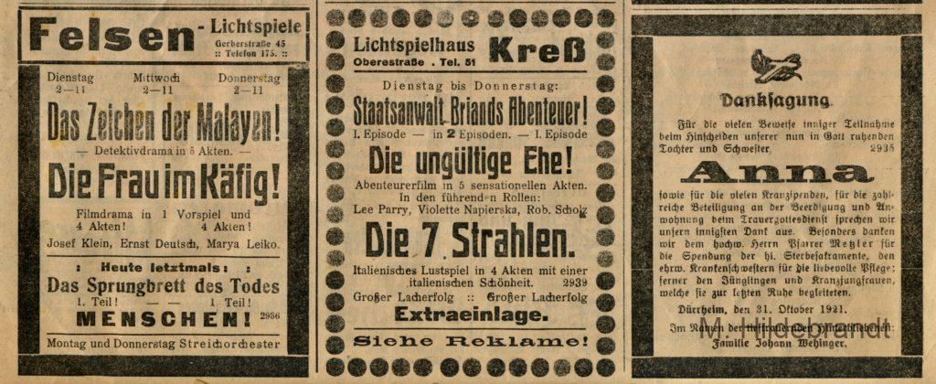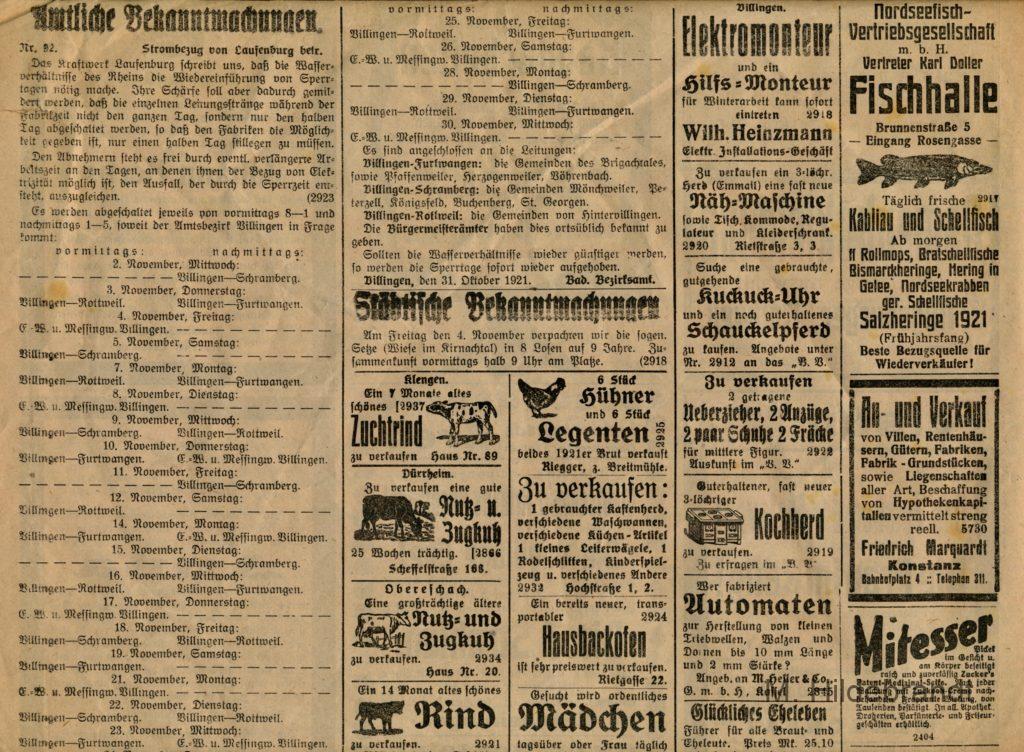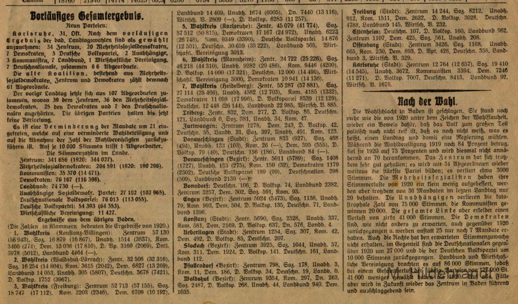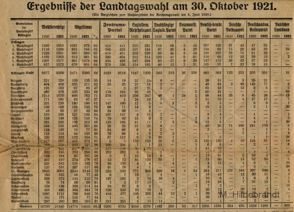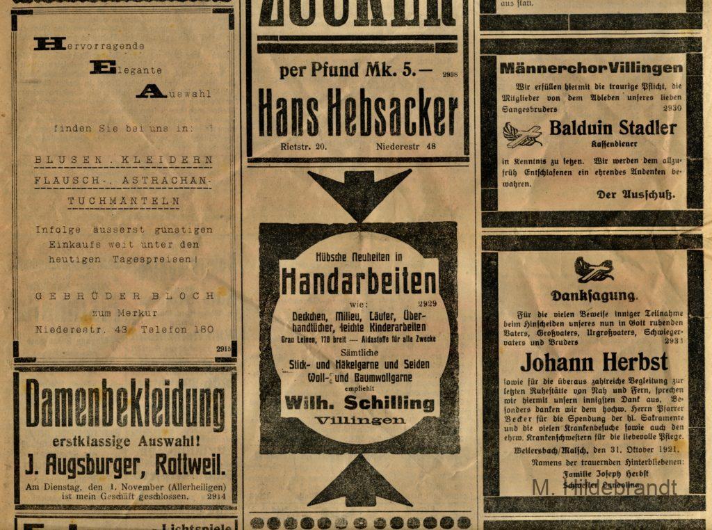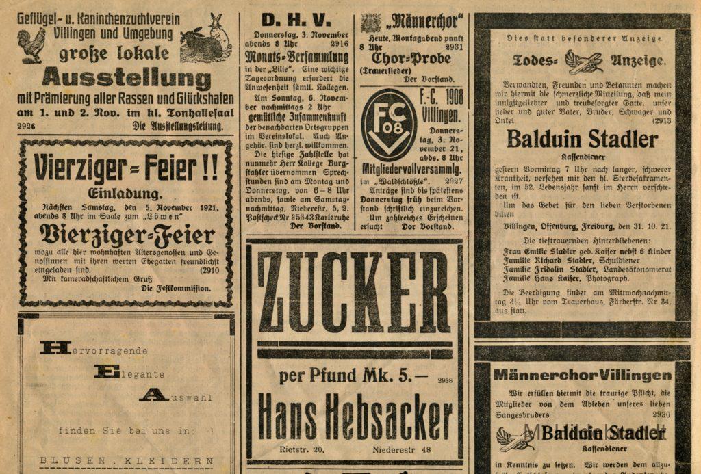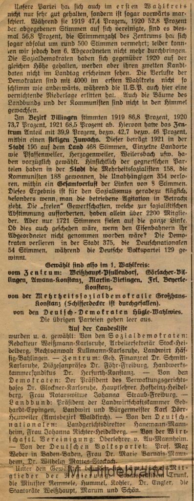 Landtagswahl Oktober 1921. Ergebnisse im Villinger Volksblatt und allgemeine Werbeseiten aus dieser Zeitung.