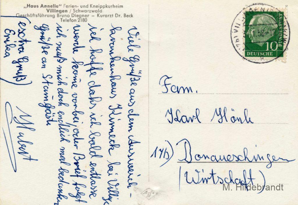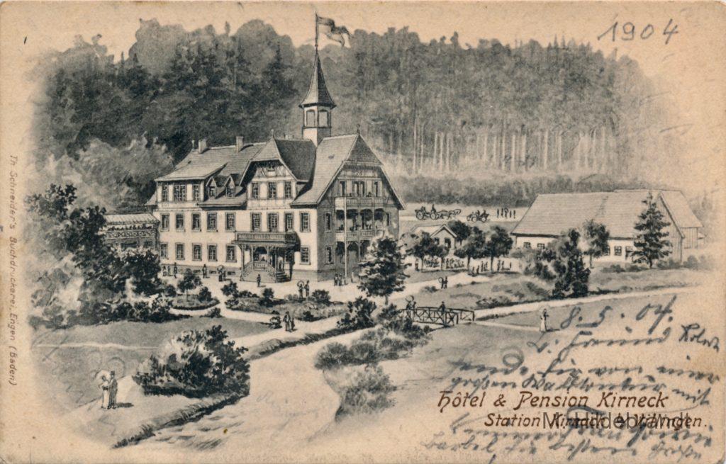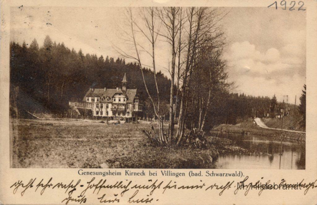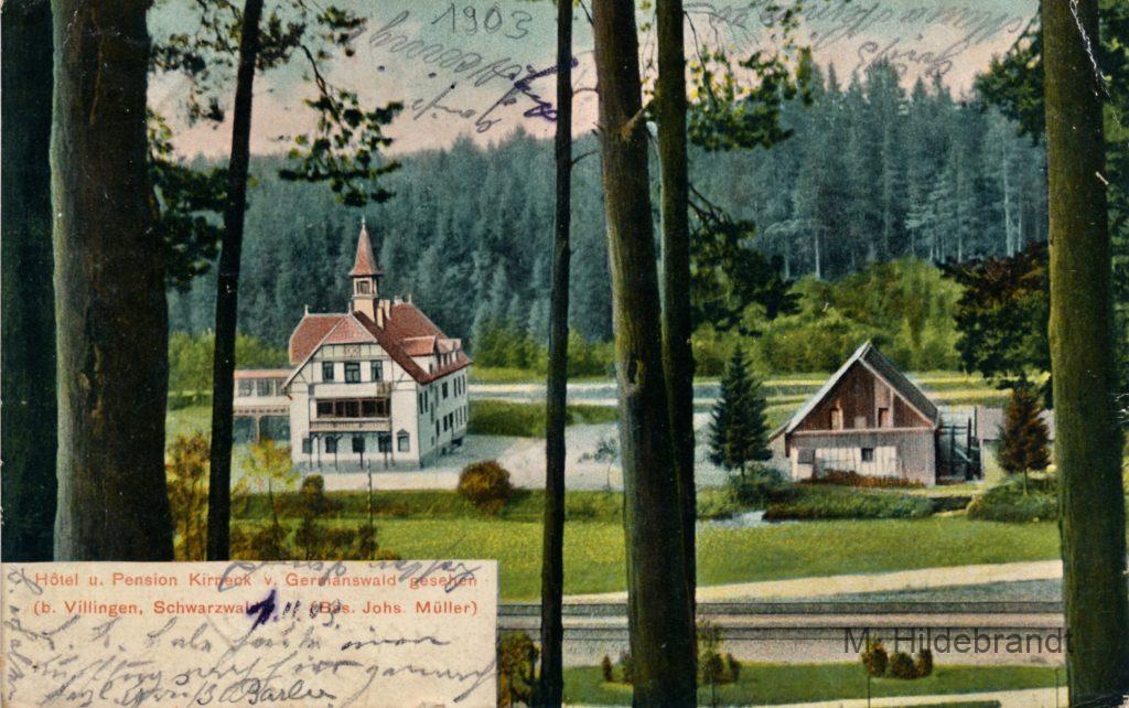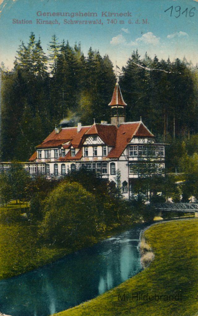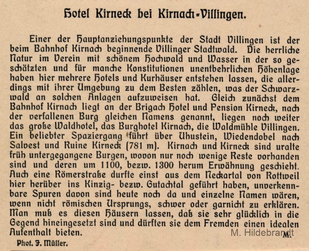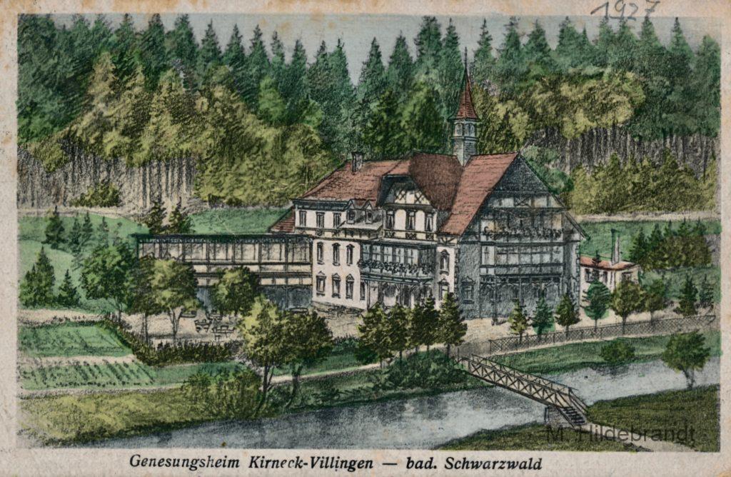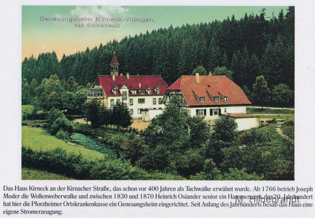 Hallo lieber Sammlerfreund Manfred, nach unserem Gespräch per Telefon zum Hotel und Erholungsheim vom Villinger Krankenhaus. Als Hotel habe ich die Gebäude nicht gekannt, aber als Genesungsheim war ich sogar in den Räumen bei einem Krankenbesuch. In den Berichten wird von einer Walkmühle berichtet, welche später zur Stromversorgung vom Waldhotel umgebaut wurde. Das Wasser der Kirnach reichte nicht aus um ständig die Turbine zu betreiben. Es wurde umgebaut im Oberlauf. Vor einigen Jahren erschien ein Bericht in der Presse über einen geheimnissvollen Kanal am Kirnacher Bahnhof. Es wurde nicht weiter berichtet, aber das war mir zu wenig, Bei einer Untersuchung im Gelände erkannte ich bald die zusammenhänge der Geheimnissvollen Kanalfunde. Um genug Wasser für die Stromerzeugung zu haben wurde Bachaufwärts an der Brigach auf der linken Seite ein zum Teil Betonierte Kanal angelegt. Auf der linken Seite war kein durchkommen, nahm die Strasse vorbei am Uhustein und dann die erste Unterführung unter der Bahnlinie. Dort angekommen lief direkt zur Brigach und sah am anderen Ufer Reste der Stellfalle und im Bachbett die Reste wo die Stellfalle in der Brigach angelegt war. Das Geheimniss war gelöst, ab hier wurde das fehlende Wasser der Kirnach zugeführt. Kurz vor der jetzigen Strasse wurde durch eine Aufschüttung ein Speicherbecken angelegt und die Wasserversorgung war gesichert. Mit Google Arth habe ich die Höhen der einzelnen Punkte in der Landschaft geprüft. Bin auch gerne bereit darüber zu Reden. Manfred Beichl