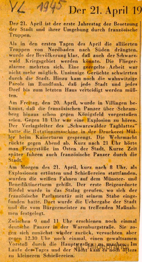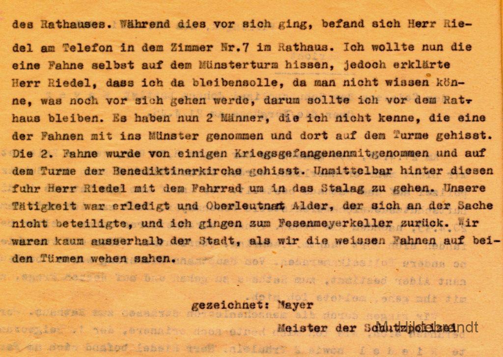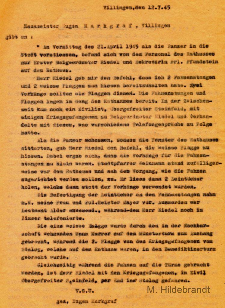 Villingen: Vorgänge am 21.04.1945. Zwei Berichte vom Meister der Schutzpolizei Johann Baptist Mayer und Hausmeister Eugen Markgraf, jeweils dokumentiert am 12. Juli 1945.