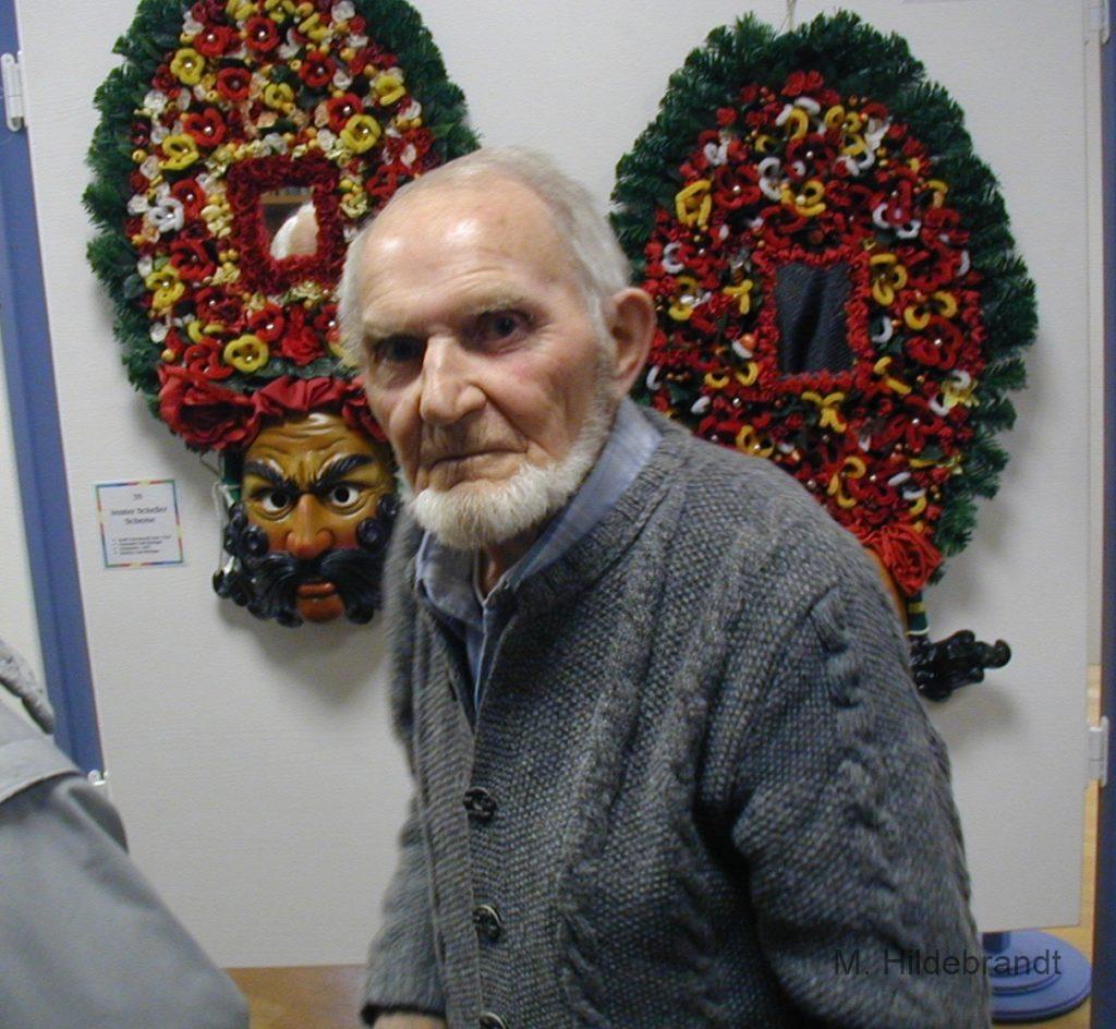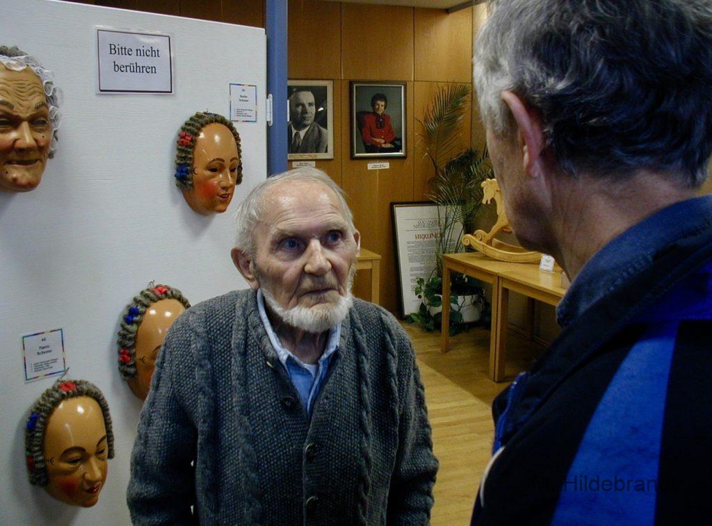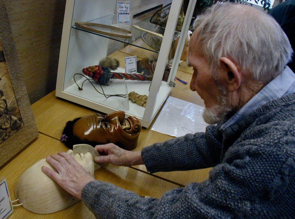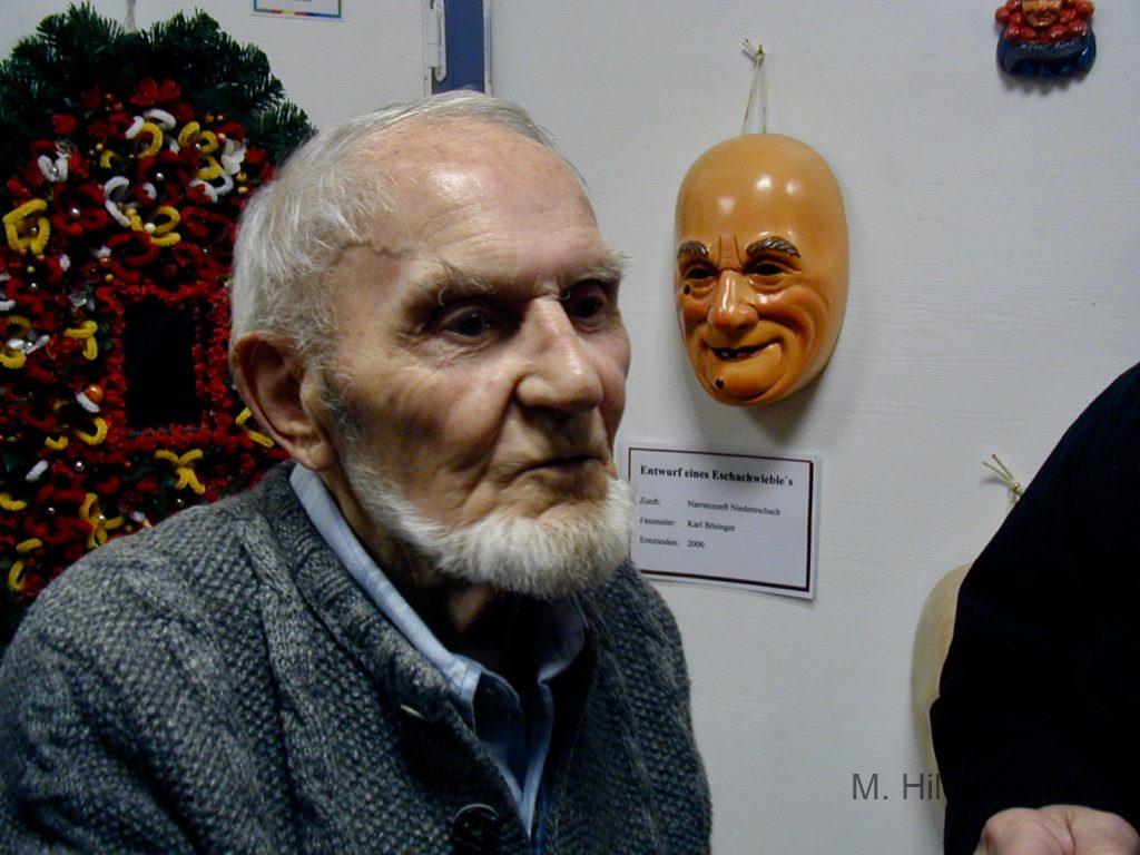 Holzschnitzer Karl Bösinger mit seiner Ausstellung 2000 in Niedereschach. Bekannt auch als Schemmen-Schnitzer von Villingen, Rottweil und weitere Masken.