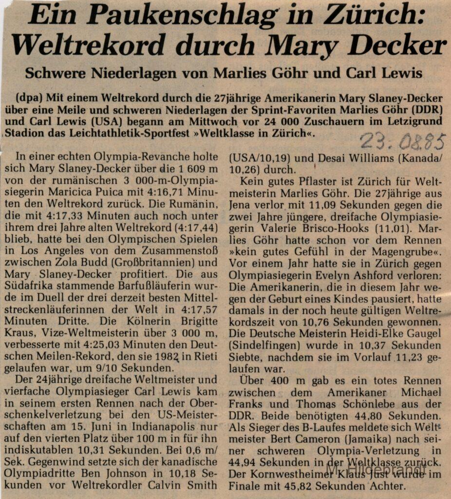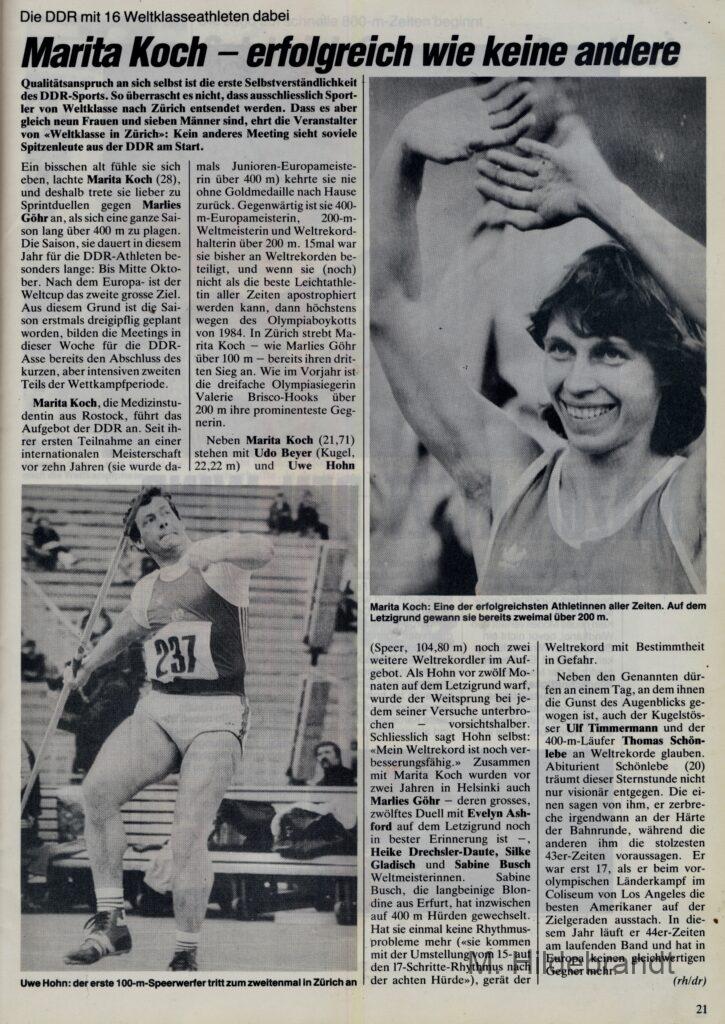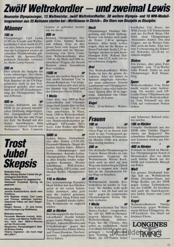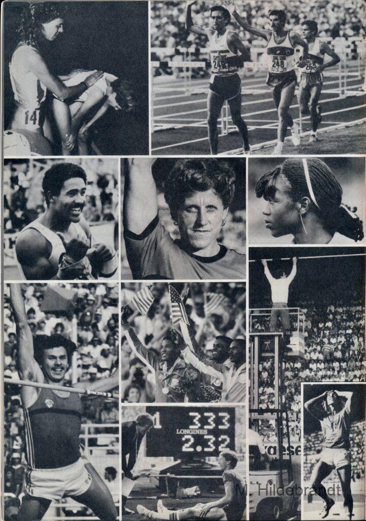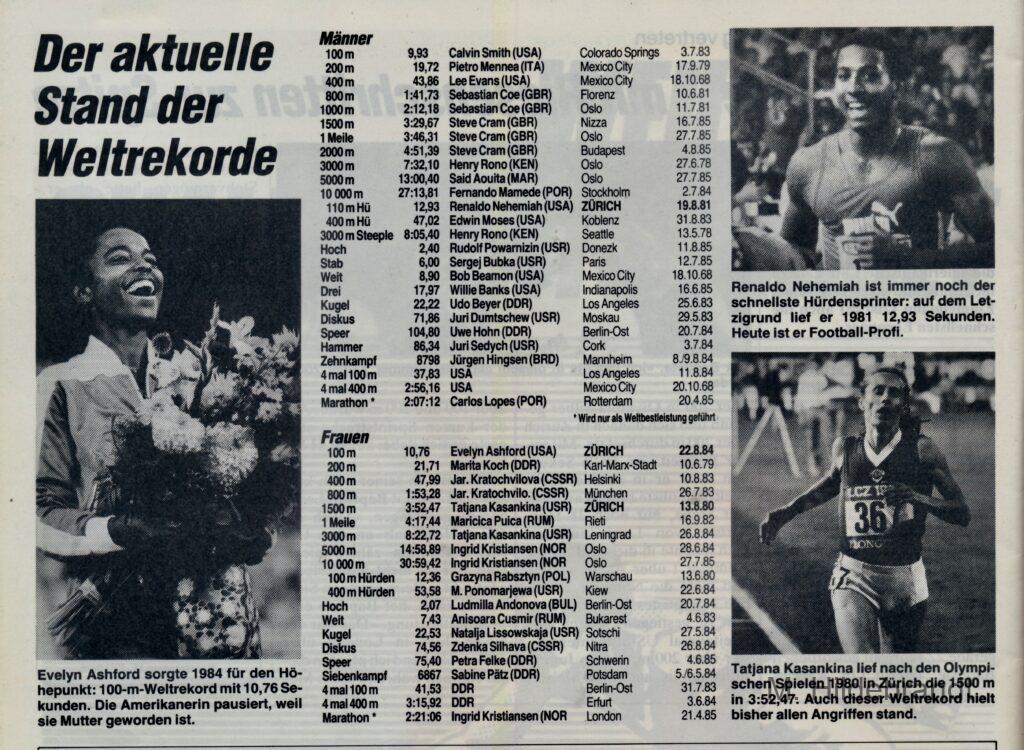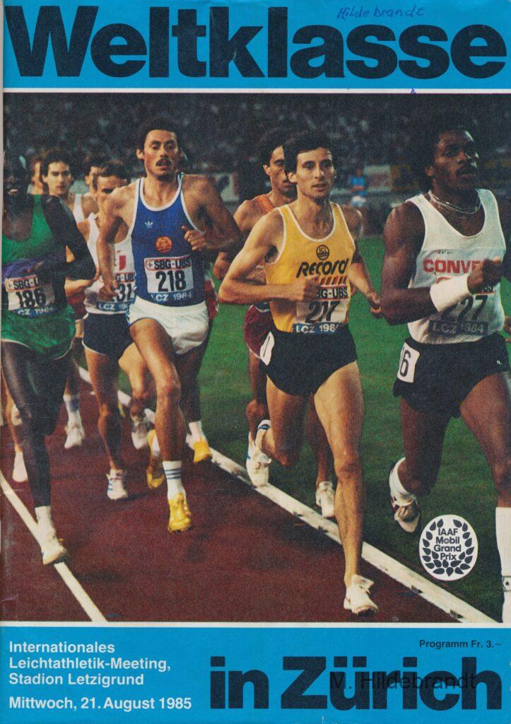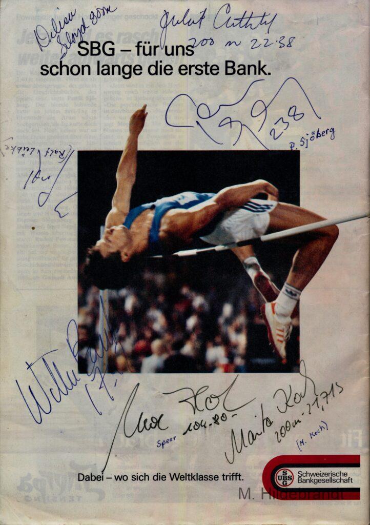 Zürich 1985 mit Leichtathletik Weltklasse : Vor dem Wettkampf auf Autogramm-Jagd im „Hotel Nofap“, dem Quartier der Sportler. Das Original-Wettkampf-Programm auch mit den damaligen Weltrekorden. Beim Speer-Rekord (104,80 Meter) wurde danach der Griff verändert.