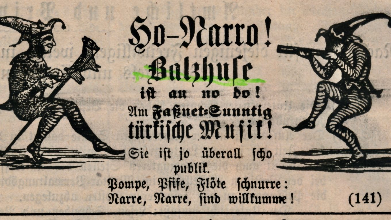 Bonndorfer Anzeiger 1878: Verkündigunsblatt mit vielen Fastnachts-Veranstaltungen in der Gegend.
