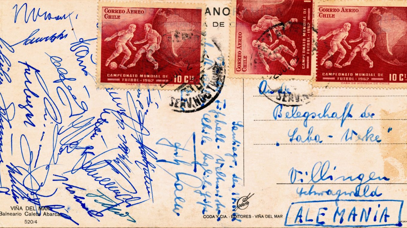 Fußball Original WM-Grüße (von bekannten National-Spielern) zur Firma Saba Villingen: 1962 Chile, 1966 England und 1970 Mexiko.