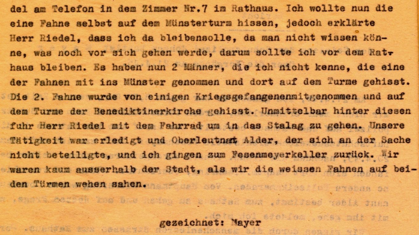 Villingen: Vorgänge am 21.04.1945. Zwei Berichte vom Meister der Schutzpolizei Johann Baptist Mayer und Hausmeister Eugen Markgraf, jeweils dokumentiert am 12. Juli 1945.