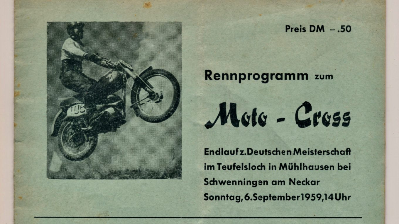 Mühlhausen bei Schwenningen: 1959 Deutsche Meisterschaft beim Moto-Cross im Teufelsloch. Das Rennprogramm mit viel Werbung von hiesigen Firmen.