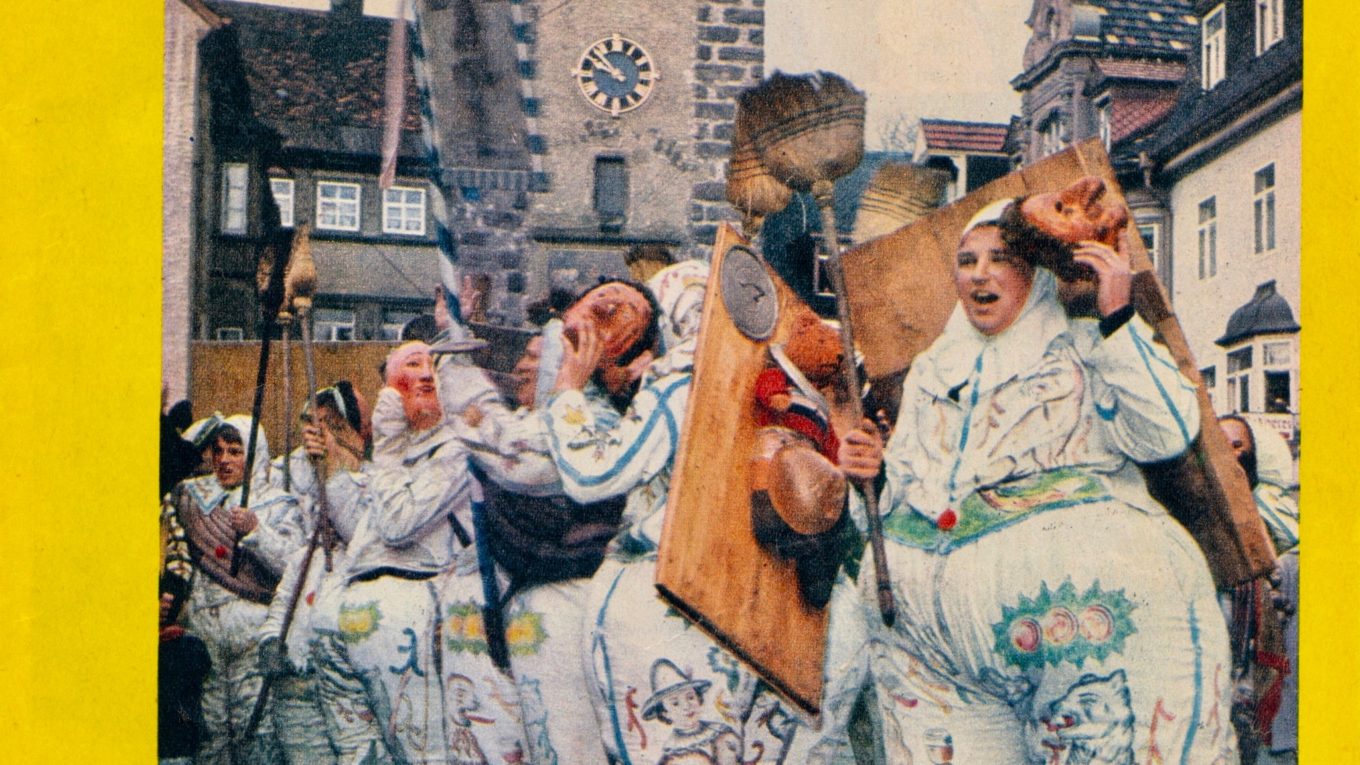 Villingen Fasnacht Turnerball 1962/63 und Dienstags-Umzug (Villinger Burgerlied durch Vereine dargestellt). Die Villinger Leichtathleten vom Turnverein gestalteten in historischen Uniformen der Feuerwehr die 4. Strophe.