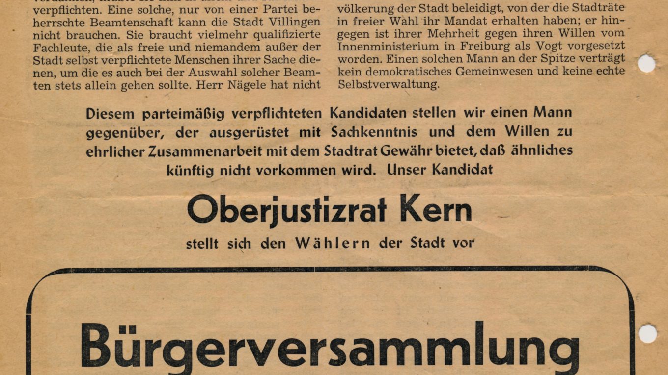 Villingen: Flugblatt 1950 an die Bevölkerung der Stadt. Oberbürgermeister-Wahl für 9 Jahre.